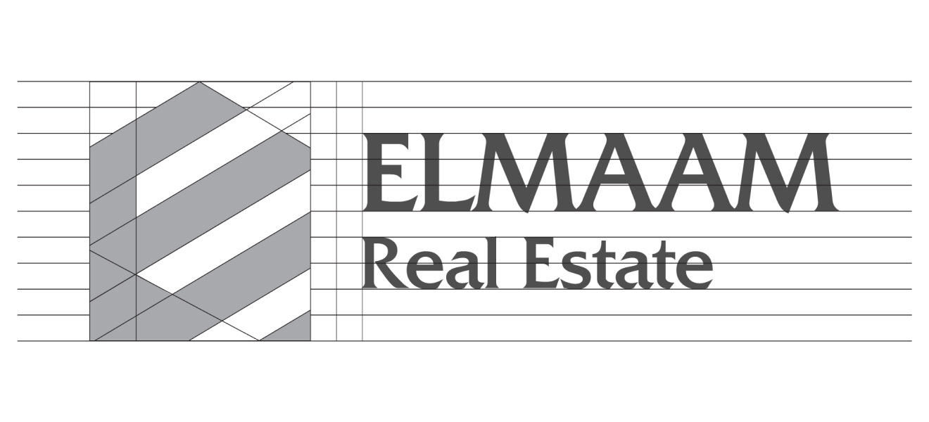 The typography system aligns both Arabic (المام للعقارات) and English (Elmaam Real Estate) versions in a balanced and elegant layout.